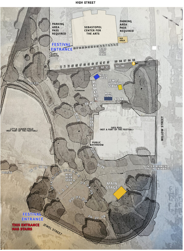 Our festival spans a portion of the back lot of Sebastopol Center for the Arts and meanders down into lively Ives Park. Take a stroll and find craft, food, non profits, sponsors, and some surprises, along with our Main Stage and Demo/Workshop Stage!